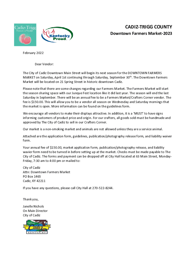 CADIZTRIGG COUNTY Downtown Farmers Market2023February 2022 Dear Vendor: The City of Cadiz Downtown Main Street will begin its next season for the DOWNTOWN FARMERS MARKET on Saturday, April 1st continuing