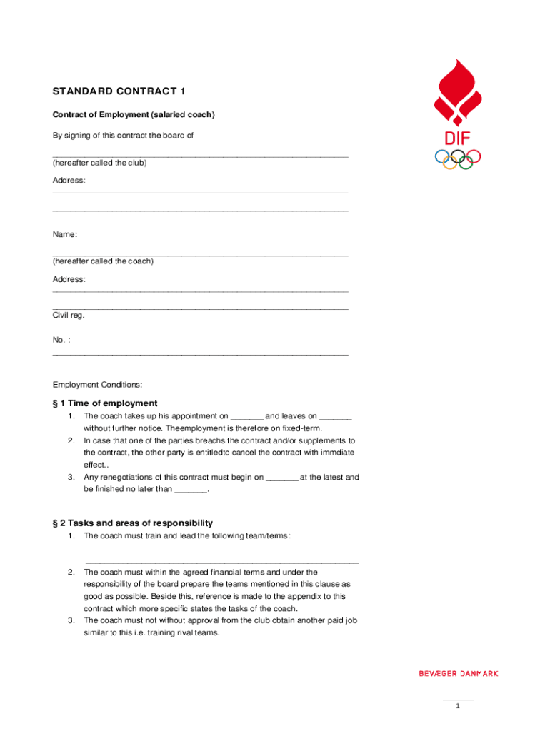 STANDARD CONTRACT 1 Contract of Employment (salaried coach) By signing of this contract the board of ___ (hereafter called the club) Address: ___ ___Name: ___ (hereafter called the coach) Address: