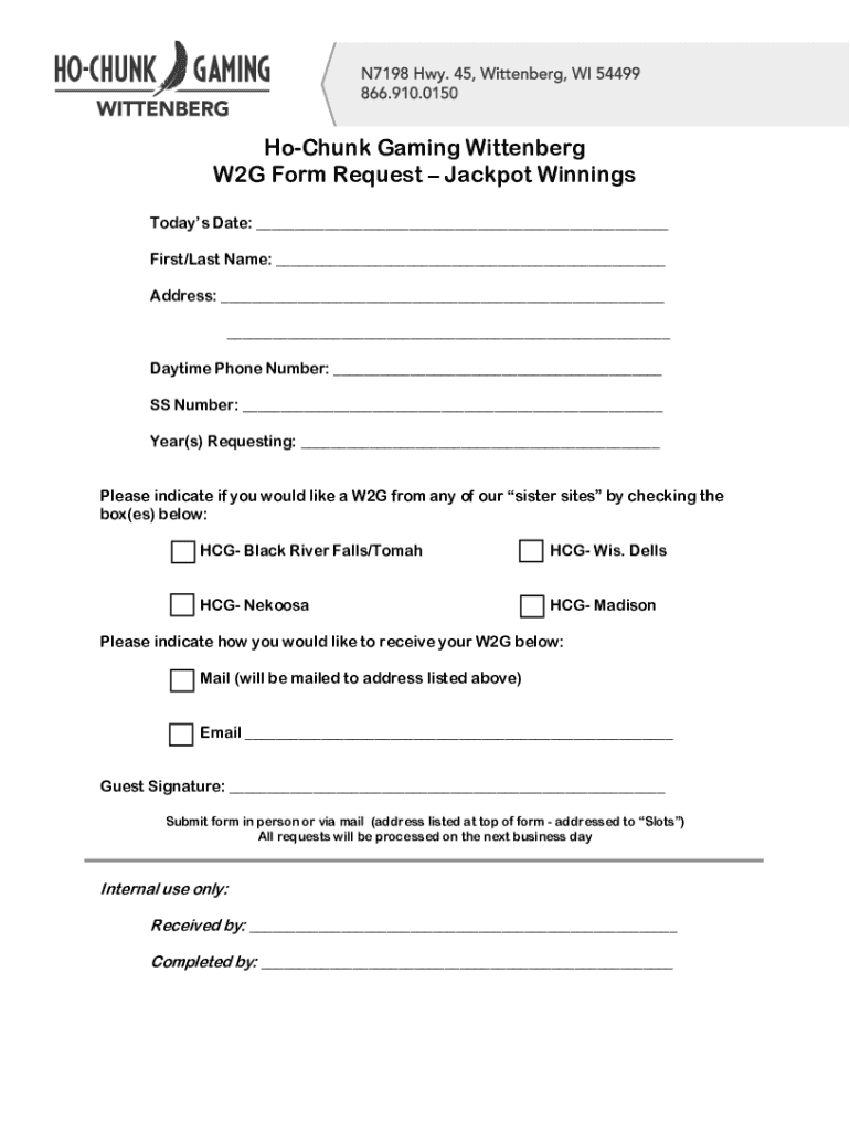 Ho Chunk Gaming Wittenberg W2G Form Request Jackpot Winnings Today's Date: ___ First/Last Name: ___ Address: ___ ___ Daytime Phone Number: ___ SS Number: ___ Year(s) Requesting: ___ Please indicate