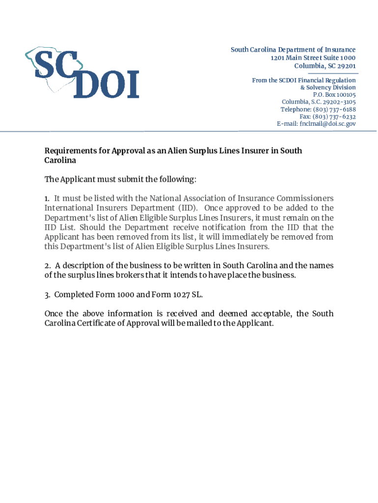 South Carolina Department of Insurance 1201 Main Street Suite 1000 Columbia, SC 29201 From the SC DOI Financial Regulation & Solvency Division P.O. Box 100105 Columbia, S.C. 292023105 Telephone: (803)