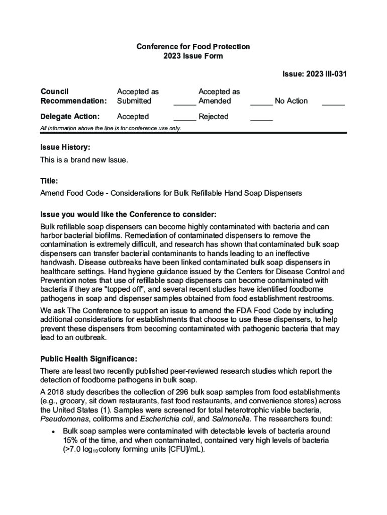 Conference for Food Protection 2023 Issue Form Issue: 2023 III031 Council Recommendation:Accepted as SubmittedAccepted as AmendedDelegate Action:AcceptedRejectedNo Factional information above the