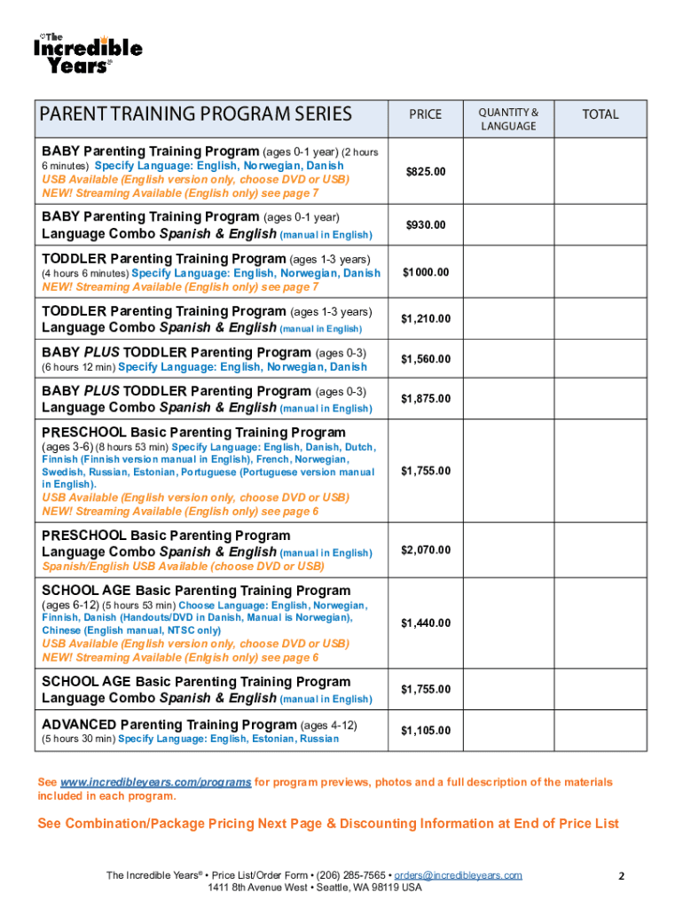 New prices effective June 15, 2021PRICE LIST AND ORDER FORM Contents Parent Training Program Series Kits..................................................................................... 23 Experts