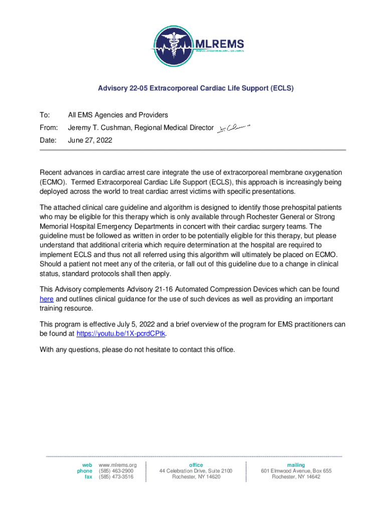 Advisory 2205 Extra corporeal Cardiac Life Support (EELS)To:All EMS Agencies and ProvidersFrom:Jeremy T. Cushman, Regional Medical Directorate:June 27, 2022Recent advances in cardiac arrest care integrate