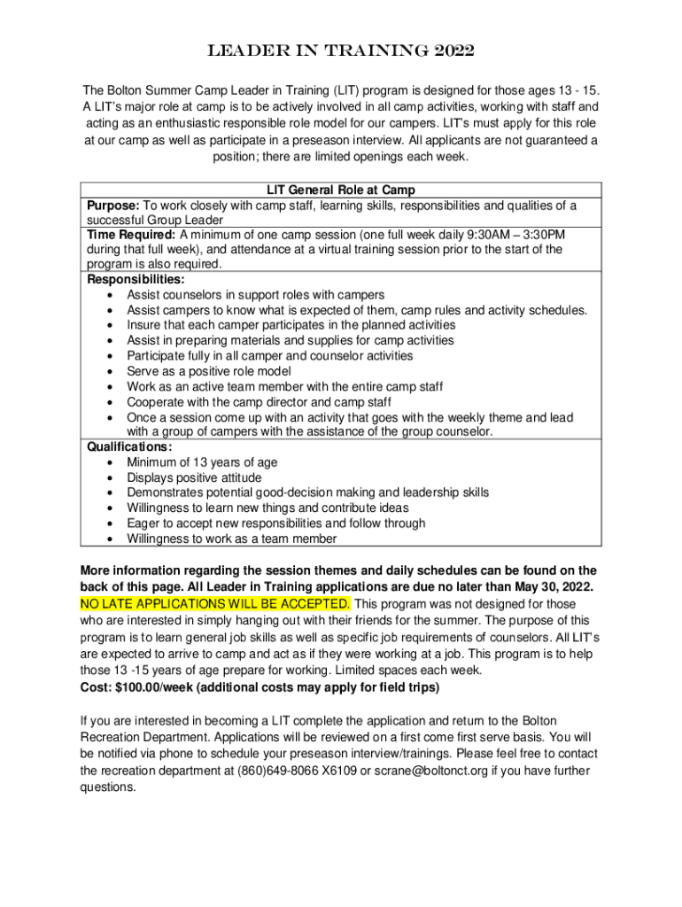 Leader in Training 2022 The Bolton Summer Camp Leader in Training (LIT) program is designed for those ages 13 15. A major role at camp is to be actively involved in all camp activities, working with