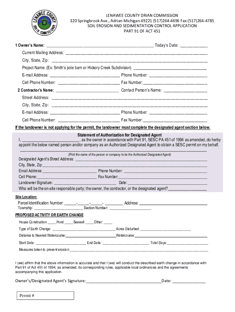LEGATEE COUNTY BRIAN COMMISSION 320 Spring brook Ave., Adrian Michigan 49221 (517)2644696 Fax:(517)2644785 SOIL EROSION AND SEDIMENTATION CONTROL APPLICATION PART 91 OF ACT 451 1 Owners Name: ___