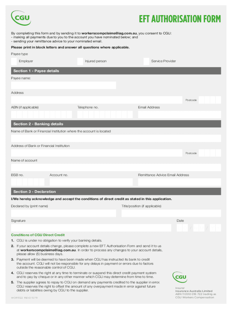 EFT Authorization FORM By completing this form and by sending it to workerscompclaims@iag.com.au, you consent to CGU: making all payments due to you to the account you have nominated below; and sending