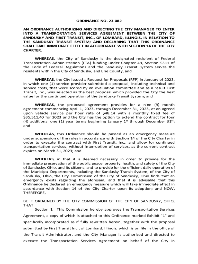 ORDINANCE NO. 23082 AN ORDINANCE AUTHORIZING AND DIRECTING THE CITY MANAGER TO ENTER INTO A TRANSPORTATION SERVICES AGREEMENT BETWEEN THE CITY OF SANDUSKY AND FIRST TRANSIT, INC., OF LOMBARD, ILLINOIS,