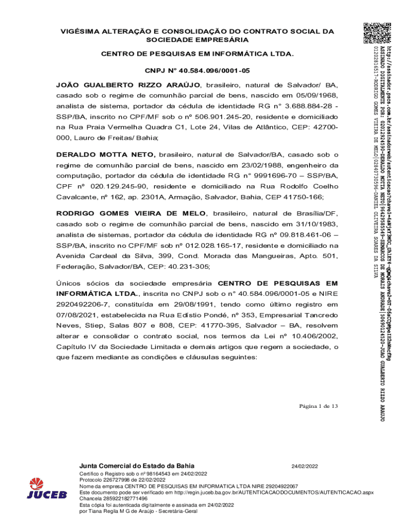Obtenha o gratuito VIGSIMA ALTERAO E CONSOLIDAO DO CONTRATO SOCIAL DA