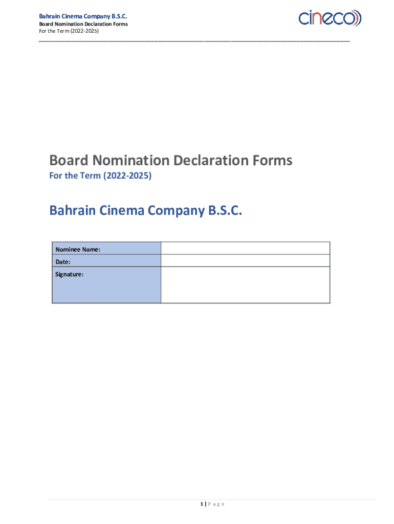 Bahrain Cinema Company B.S.C. Board Nomination Declaration Forms For the Term (20222025)___Board Nomination Declaration Forms For the Term (20222025)Bahrain Cinema Company B.S.C. Nominee Name: Date: