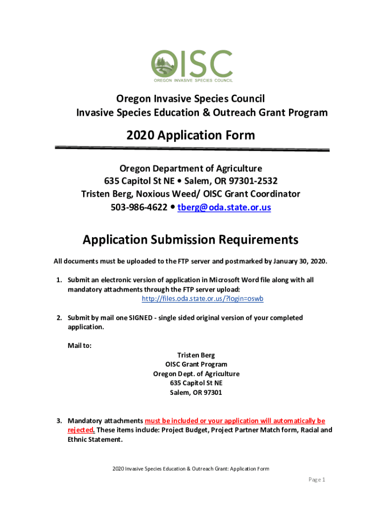 Oregon Invasive Species Council Invasive Species Education & Outreach Grant Program2020 Application Form Oregon Department of Agriculture 635 Capitol St NE Salem, OR 973012532 Tristan Berg, Noxious
