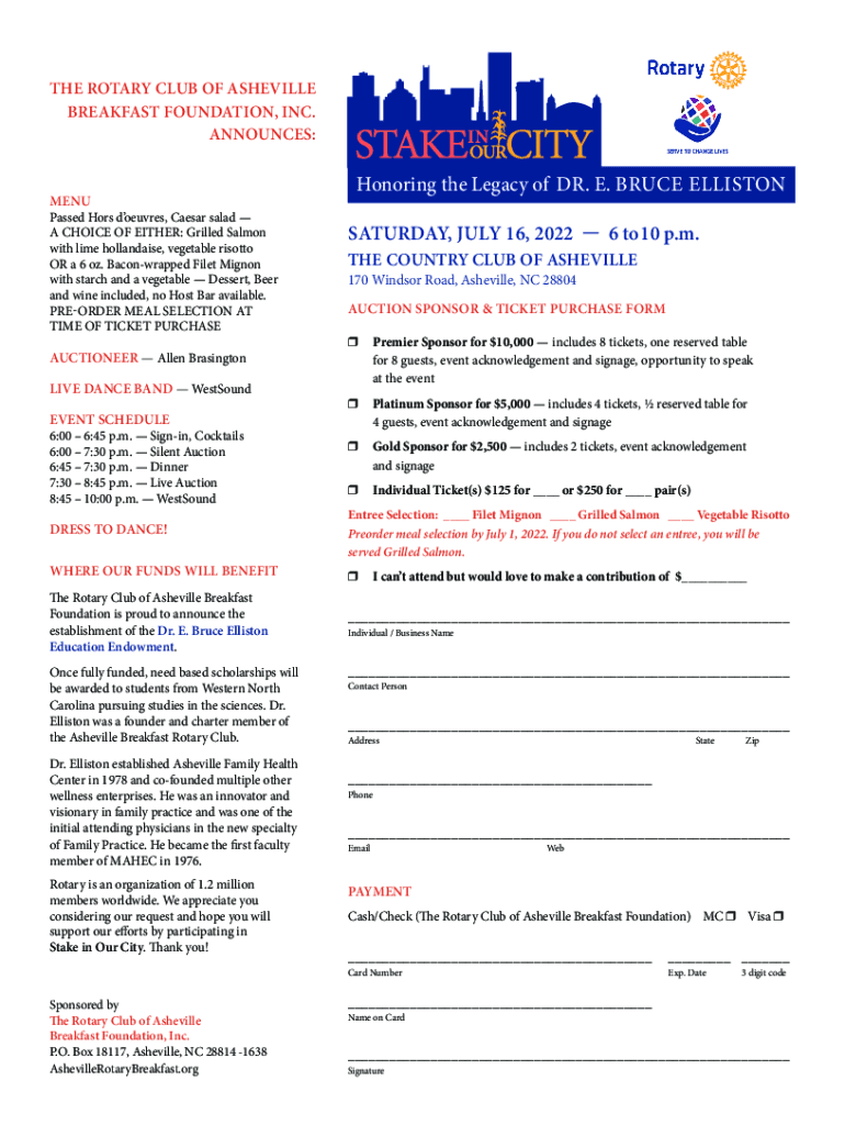 THE ROTARY CLUB OF ASHEVILLE BREAKFAST FOUNDATION, INC. ANNOUNCES:Menopause Hours oeuvres, Caesar salad A CHOICE OF EITHER: Grilled Salmon with lime hollandaise, vegetable risotto OR a 6 oz. Bacon