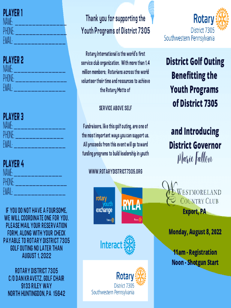 PLAYER 1 NAME: ___ PHONE: ___ EMAIL: ___ PLAYER 2 NAME: ___ PHONE: ___ EMAIL: ___ PLAYER 3 NAME: ___ PHONE: ___ EMAIL: ___ PLAYER 4 NAME: ___ PHONE: ___ EMAIL: ___ IF YOU DO NOT HAVE A FOURSOME, WE
