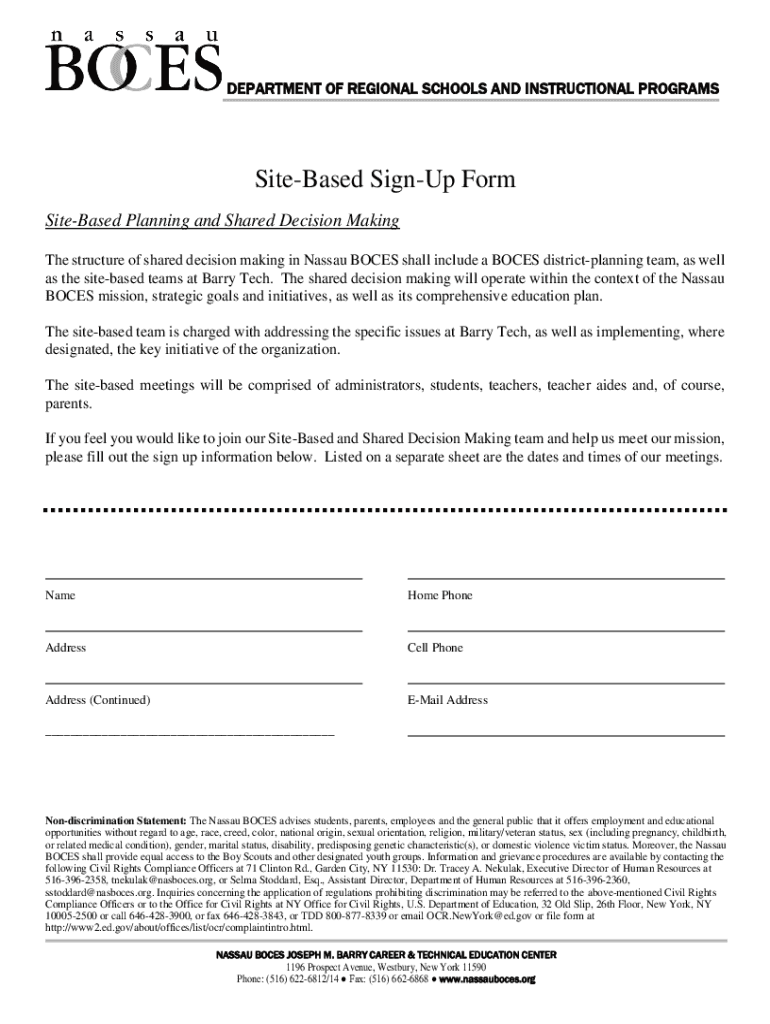 DEPARTMENT OF REGIONAL SCHOOLS AND INSTRUCTIONAL PROGRAMSSiteBased Sign-up Form Situated Planning and Shared Decision Making The structure of shared decision-making in Nassau BONES shall include a