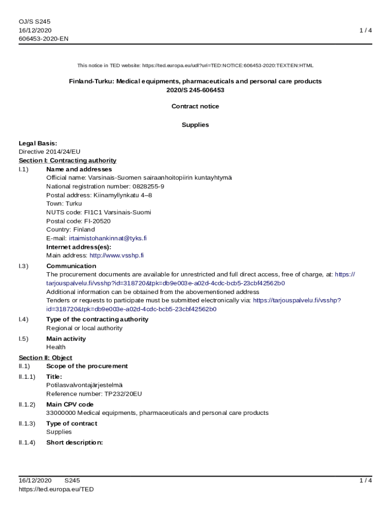 6064532020EN1/4This notice in TED website: https://ted.europa.eu/udl?uriTED:NOTICE:6064532020:TEXT:EN:HTMLFinlandTurku: Medical equipments, pharmaceuticals and personal care products
