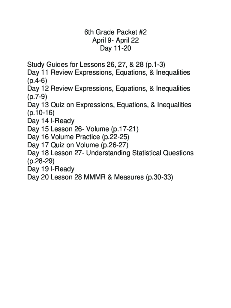 6th Grade Packet #2 April 9 April 22 Day 1120 Study Guides for Lessons 26, 27, & 28 (p.13) Day 11 Review Expressions, Equations, & Inequalities (p.46) Day 12 Review Expressions, Equations, & Inequalities
