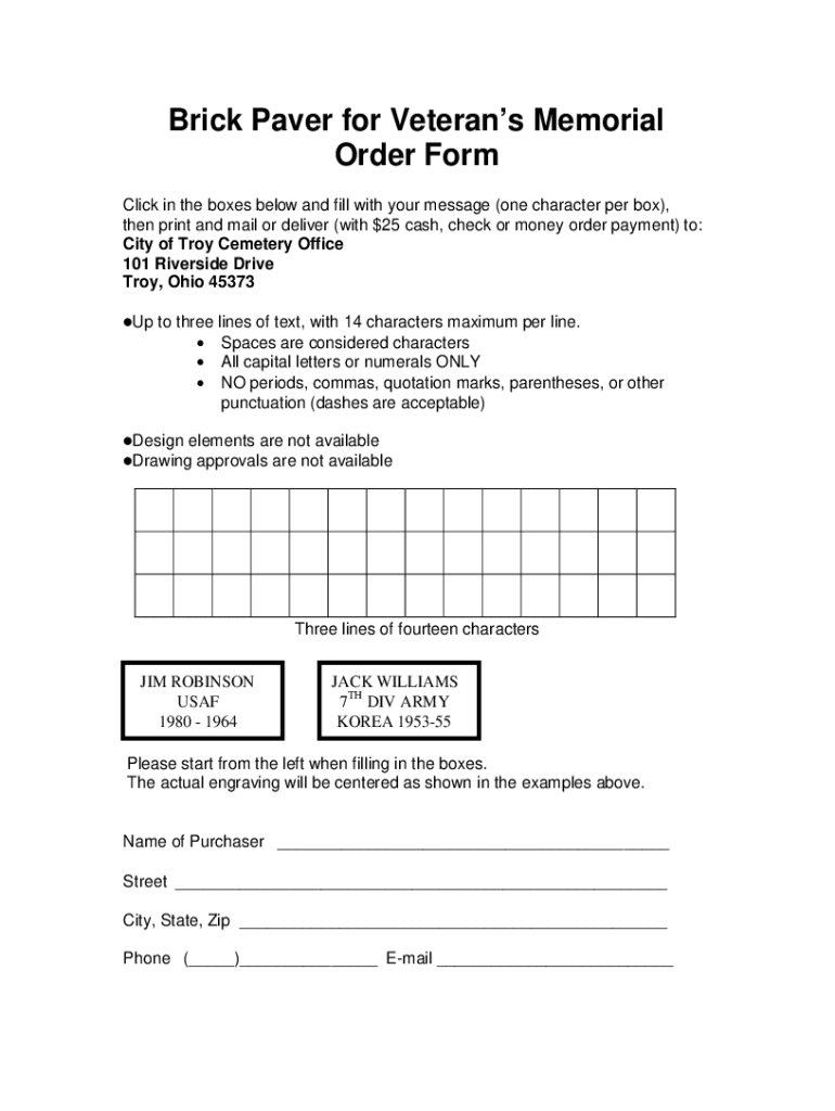 Brick Paver for Veterans Memorial Order Form Click in the boxes below and fill with your message (one character per box), then print and mail or deliver (with $25 cash, check or money order payment)