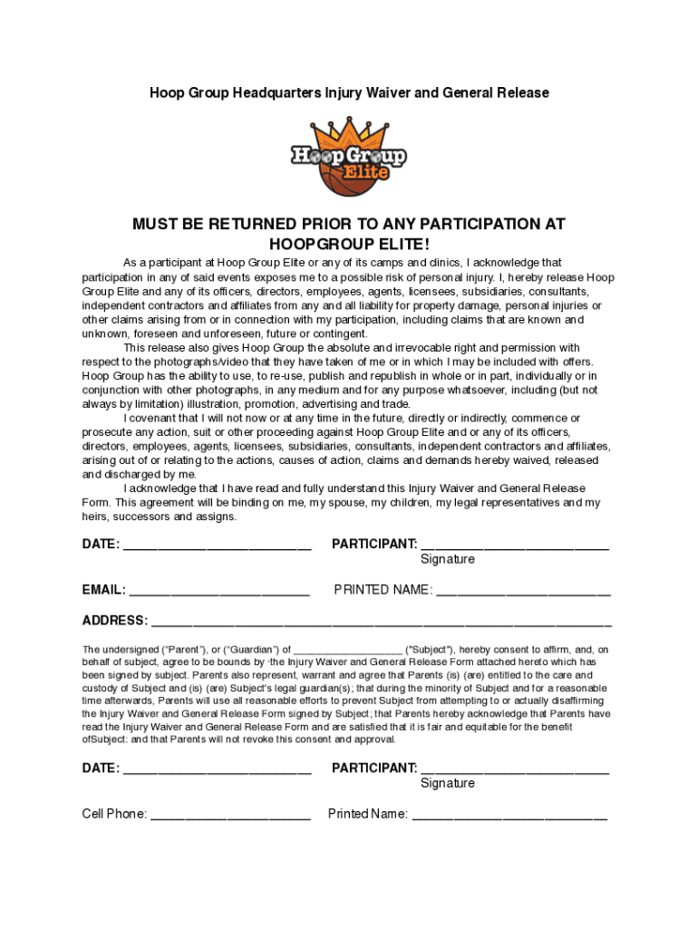 Hoop Group Headquarters Injury Waiver and General Releases BE RETURNED PRIOR TO ANY PARTICIPATION AT