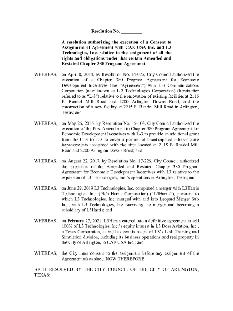 Resolution No. ___ A resolution authorizing the execution of a Consent to Assignment of Agreement with CAE USA Inc. and L3 Technologies, Inc. relative to the assignment of all the rights and obligations