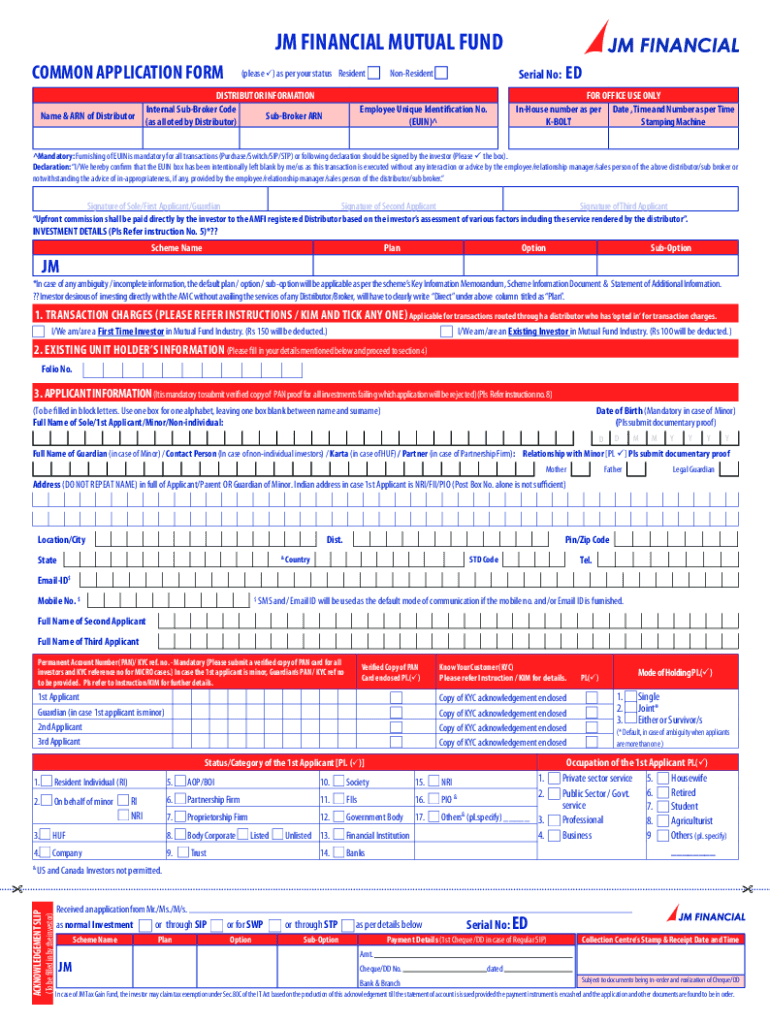 JM FINANCIAL MUTUAL FUND COMMON APPLICATION FORM Name & ARN of Distributor(please) as per your status ResidentDISTRIBUTOR INFORMATION Internal Broker Code Broker ARN (as allotted by Distributor)Serial