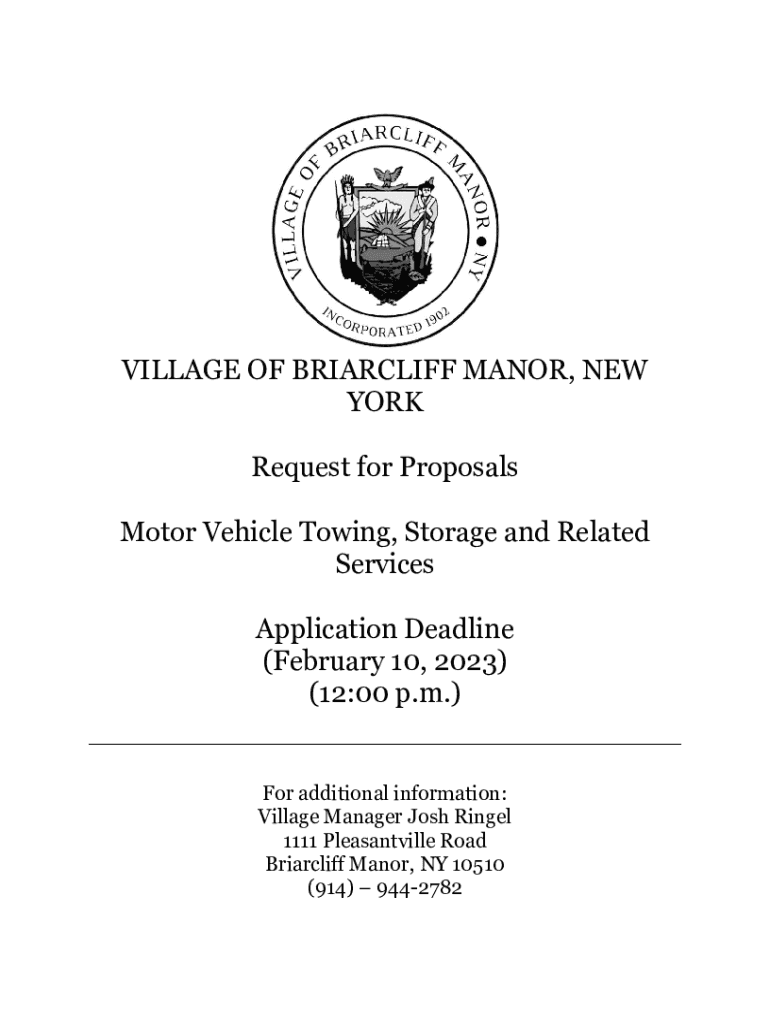 VILLAGE OF RADCLIFF MANOR, NEW YORK Request for Proposals Motor Vehicle Towing, Storage and Related Services Application Deadline (February 10, 2023) (12:00 p.m.) For additional information: Village