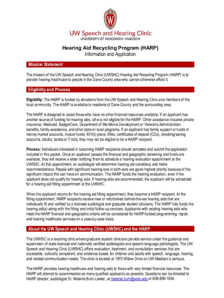 Hearing Aid Recycling Program (HARP) Information and Application Mission Statement The mission of the UW Speech and Hearing Clinic (USMC) Hearing Aid Recycling Program (HARP) is to provide hearing