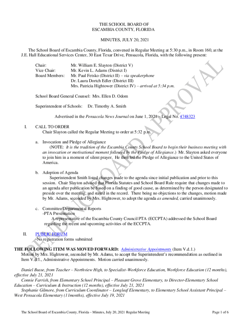 THE SCHOOL BOARD OF ESCAMBIA COUNTY, FLORIDA MINUTES, JULY 20, 2021, The School Board of Escambia County, Florida, convened in Regular Meeting at 5:30 p.m., in Room 160, at the J.E. Hall Educational
