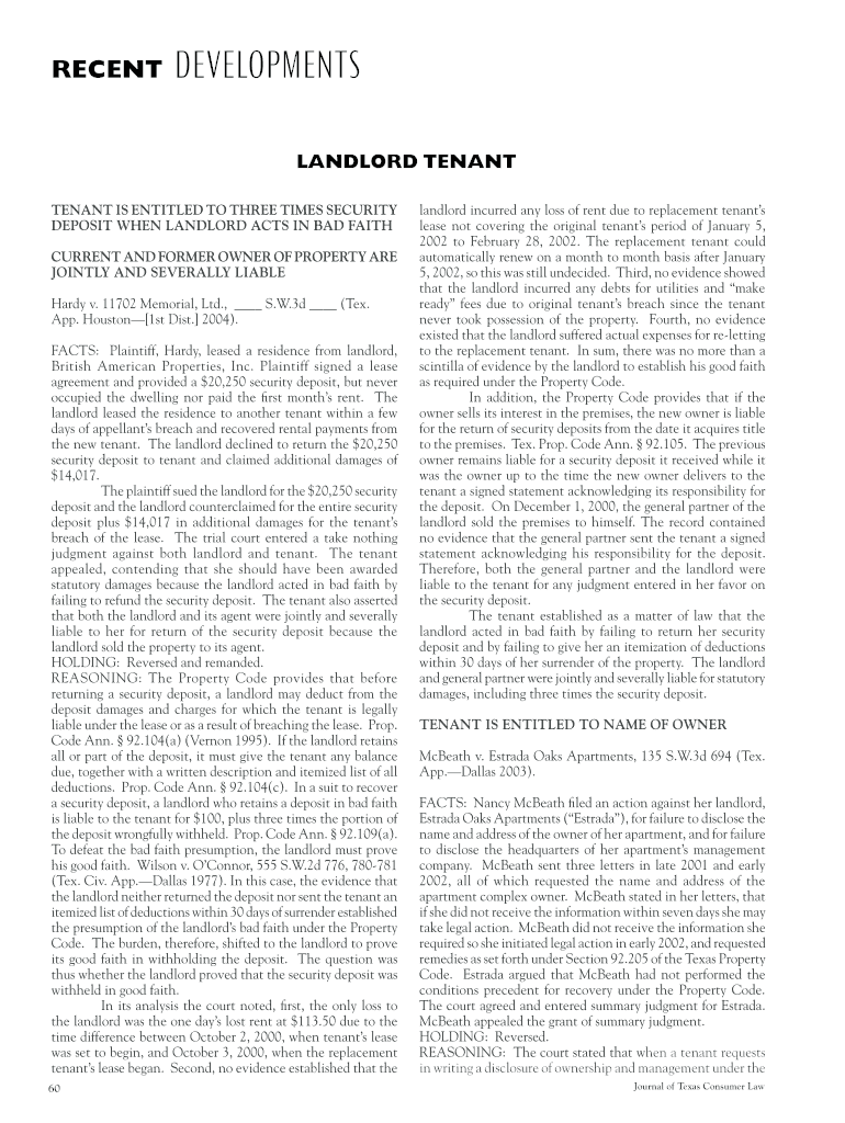 RECENTDEVELOPMENTS LANDLORD TENANTTENANT IS ENTITLED TO THREE TIMES SECURITY DEPOSIT WHEN LANDLORD ACTS IN BAD FAITH CURRENT AND FORMER OWNER OF PROPERTY ARE JOINTLY AND SEVERALLY LIABLE Hardy v.