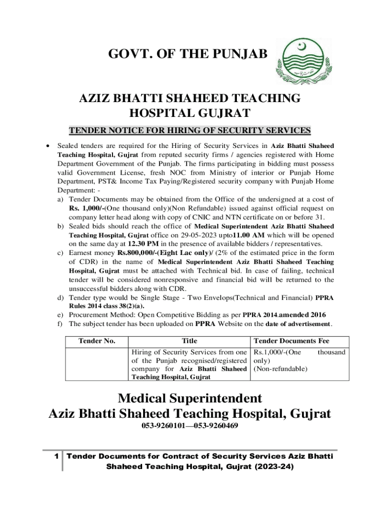 GOVT. OF THE PUNJABI BHA TTI SHAHEED TEACHING HOSPITAL GUJRAT TENDER NOTICE FOR HIRING OF SECURITY SERVICES Sealed tenders are required for the Hiring of Security Services in Aziz Haiti Shaheed Teaching
