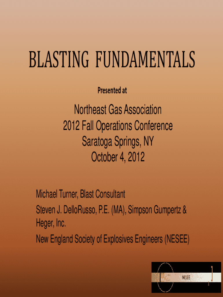 BLASTING FUNDAMENTALS Presented at Northeast Gas Association 2012 Fall Operations Conference Saratoga Springs, NY October 4, 2012Michael Turner, Blast Consultant Steven J. DelloRusso, P.E. (MA), Simpson
