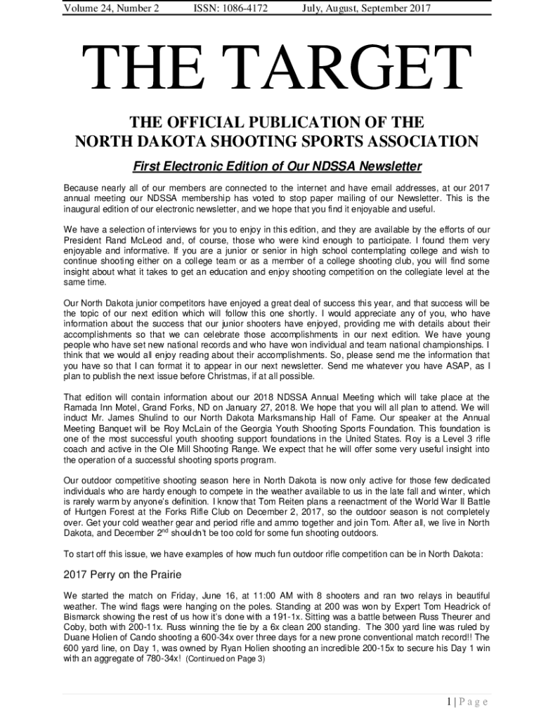 Volume 24, Number 2ISSN: 10864172July, August, September 2017THE TARGET THE OFFICIAL PUBLICATION OF THE NORTH DAKOTA SHOOTING SPORTS ASSOCIATION First Electronic Edition of Our ND SSA Newsletter Because