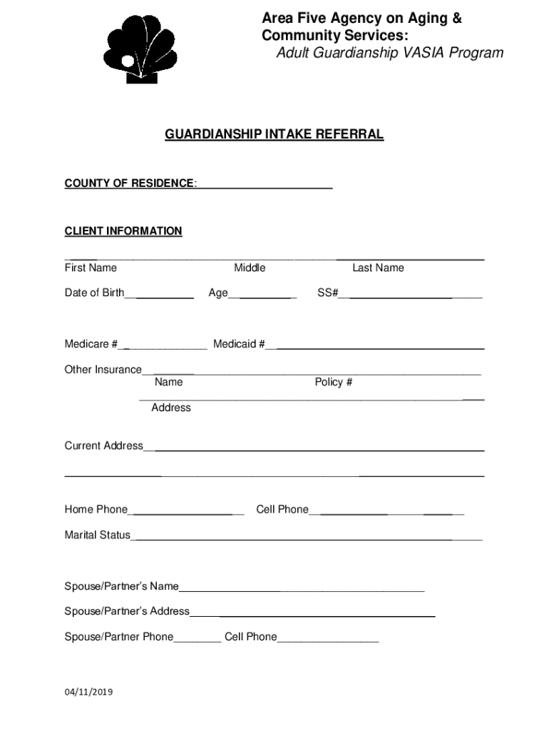 Area Five Agencies on Aging & Community Services: Adult Guardianship ASIA ProgramGUARDIANSHIP INTAKE REFERRALCOUNTY OF RESIDENCE:______CLIENT INFORMATION _ ___ First Name Middle Date of Birth__Age___Last