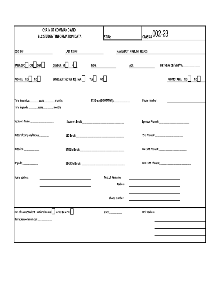 CHAIN OF COMMAND AND BLC STUDENT INFORMATION DATA DOD ID # RANK: SPC PROFILE: YEAST#:LAST 4 SSN#: CPL SGT GENDER: MF EKG RESULTS (OVER 40): N/Time in service:___years___ monthsCLASS #00223NAME (LAST,