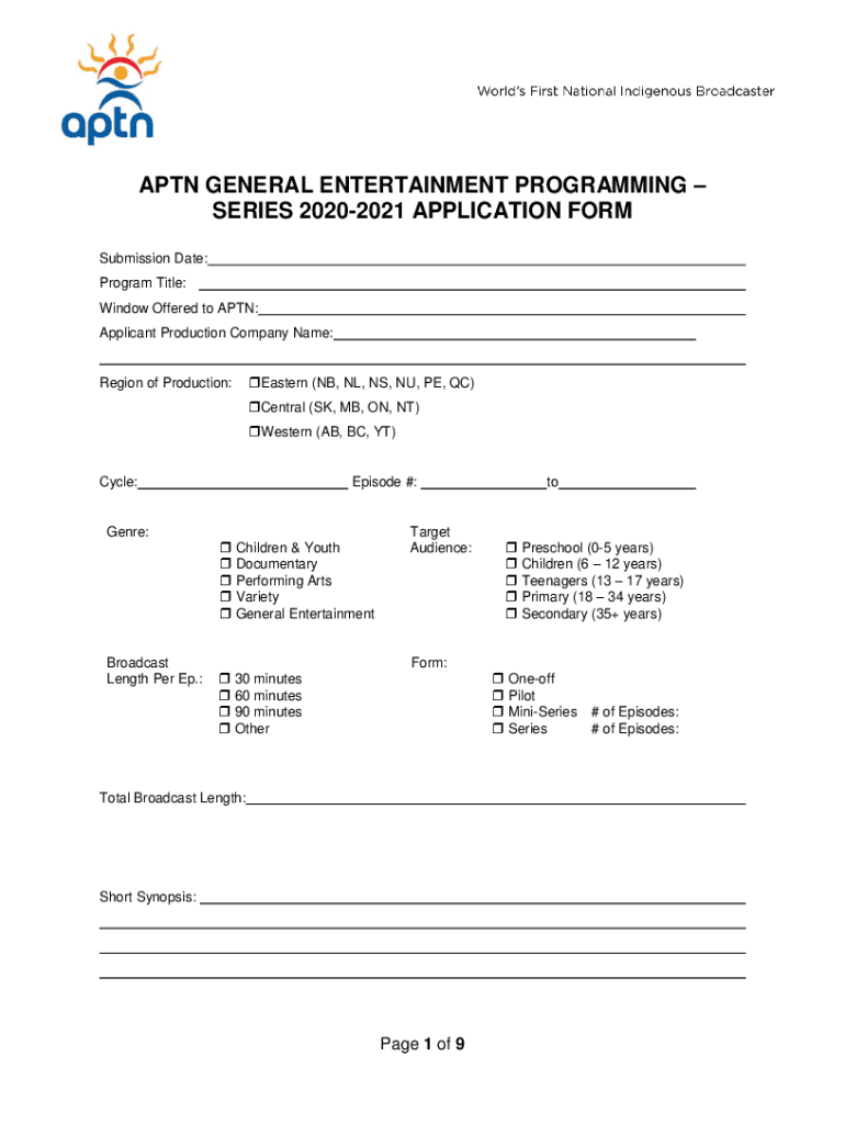 APT GENERAL ENTERTAINMENT PROGRAMMING SERIES 20202021 APPLICATION FORM Submission Date: Program Title: Window Offered to APT: Applicant Production Company Name:Region of Production:Eastern (NB, NL,