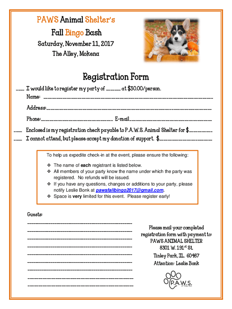 PAWS Animal Shelters Fall Bingo Bash Saturday, November 11, 2017, The Alley, MokenaRegistration Form ___ I would like to register my party of ___ at $30.00/person. Name: ___ Address:___ Phone:___