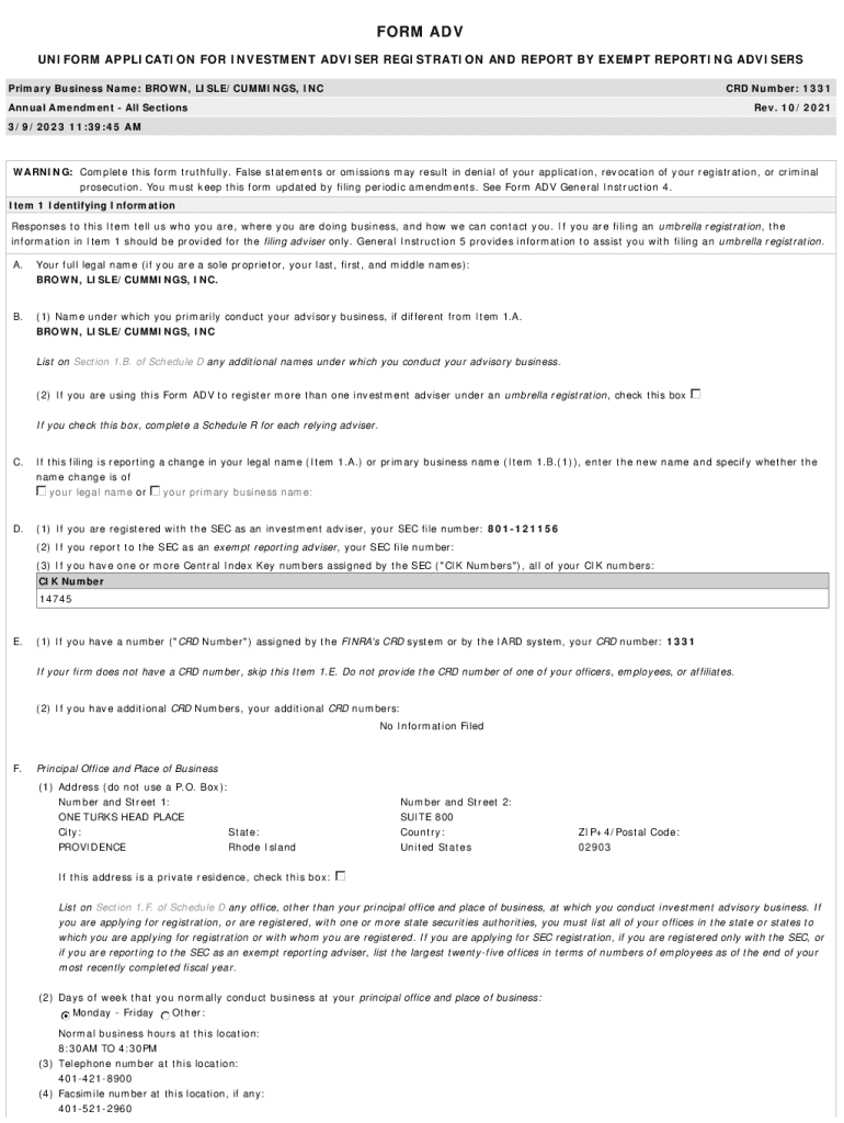 FORM ADV UNIFORM APPLICATION FOR INVESTMENT ADVISER REGISTRATION AND REPORT BY EXEMPT REPORTING ADVISERS Primary Business Name: BROWN, LISLE/CUMMINGS, INC CRD Number: 1331Annual Amendment All Sections