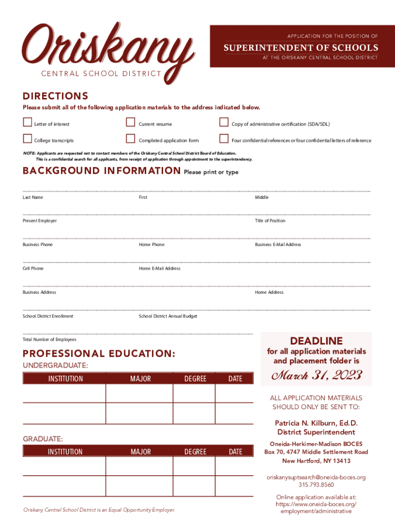 OriskanyAPPLICATION FOR THE POSITION SUPERINTENDENT OF SCHOOLS AT THE BRISBANE CENTRAL SCHOOL DISTRICTCENTRAL SCHOOL DISTRICTDIRECTIONSPlease submit all the following application materials to the