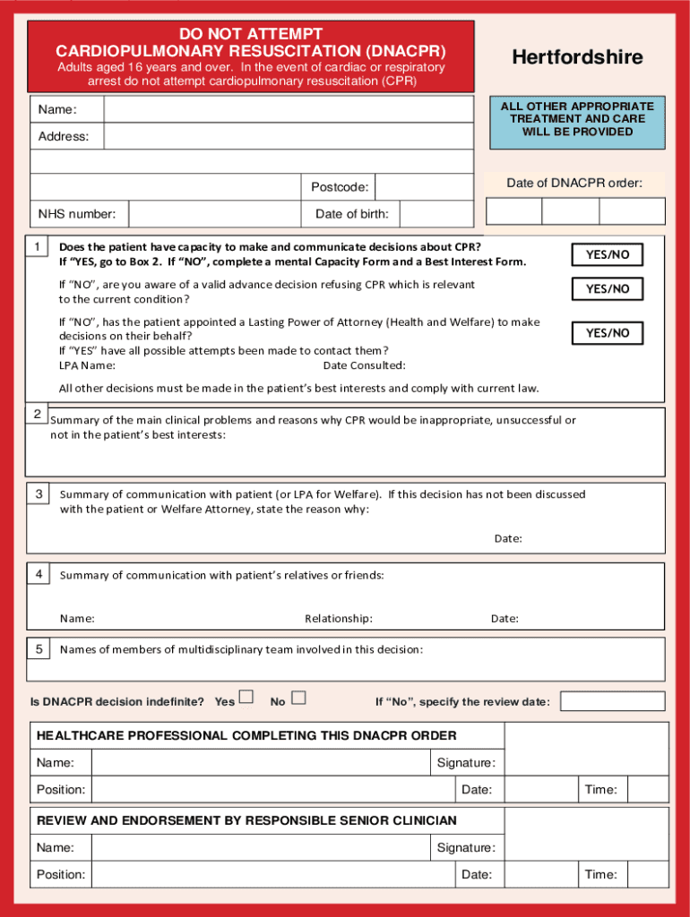 DO NOT ATTEMPT CARDIOPULMONARY RESUSCITATION (DNA CPR)HertfordshireAdults aged 16 years and over. In the event of cardiac or respiratory arrest do not attempt cardiopulmonary resuscitation (CPR)ALL