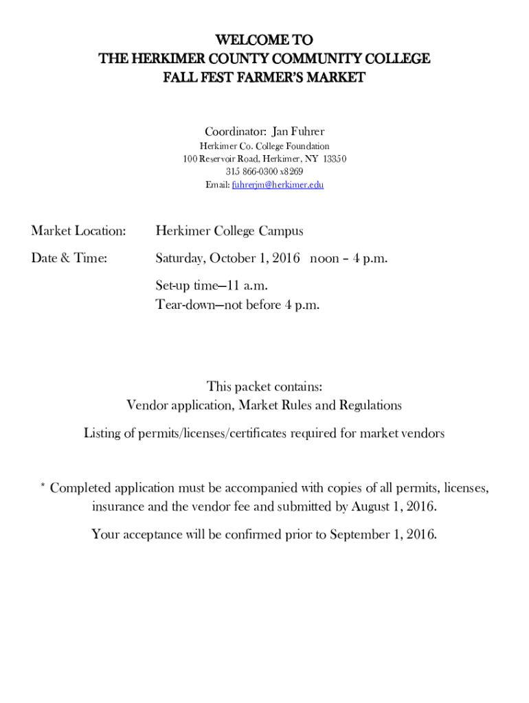 WELCOME TO THE PERKIER COUNTY COMMUNITY COLLEGE FALL FEST FARMERS MARKETCoordinator: Jan Führer Perkier Co. College Foundation 100 Reservoir Road, Perkier, NY 13350 315 8660300 x8269 Email: fuhrerjm@herkimer.eduMarket