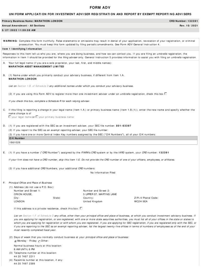FORM ADV UNIFORM APPLICATION FOR INVESTMENT ADVISER REGISTRATION AND REPORT BY EXEMPT REPORTING ADVISERS Primary Business Name: MARATHONLONDONCRD Number: 132391Annual Amendment All Sections Rev. 10/20215/27/2022