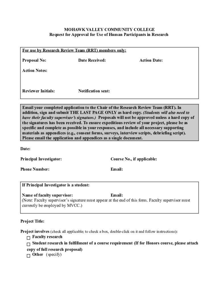 MOHAWK VALLEY COMMUNITY COLLEGE Request for Approval for Use of Human Participants in Research For use by Research Review Team (RRT) members only: Proposal No:Date Received:Action Date:Action Notes:Reviewer