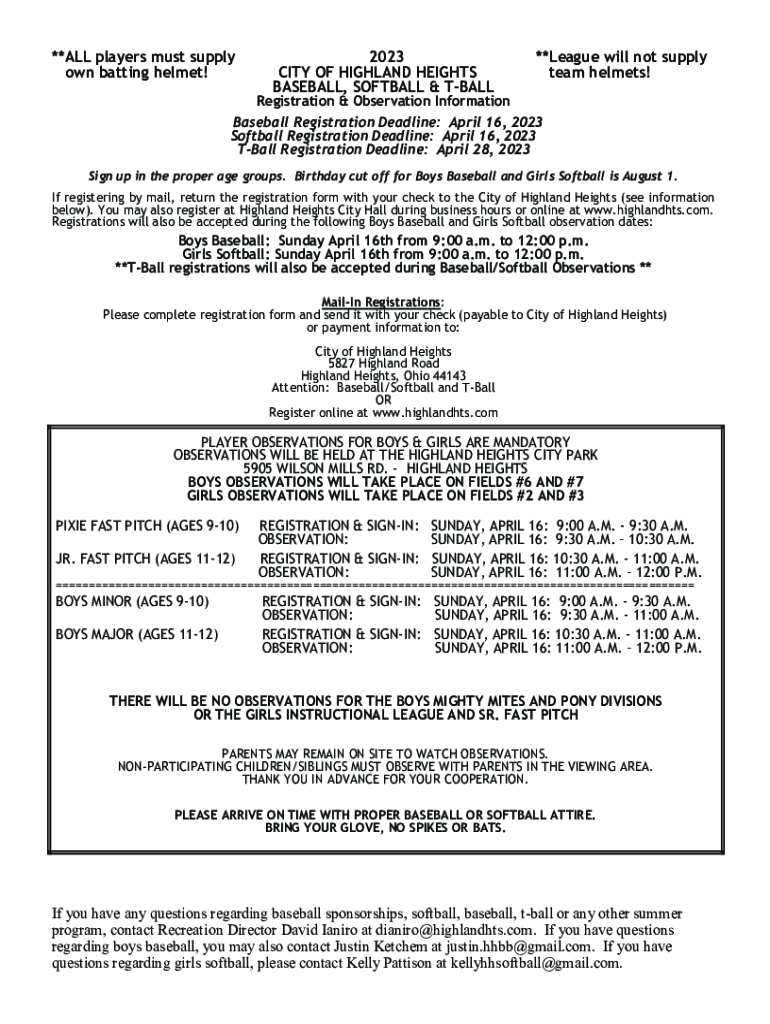 **ALL players must supply own batting helmet!2023 CITY OF HIGHLAND HEIGHTS BASEBALL, SOFTBALL & BALL**League will not supply team helmets! Registration & Observation Information Baseball Registration