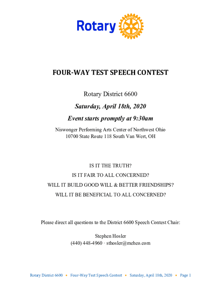 NORWAY TEST SPEECH CONTEST Rotary District 6600 Saturday, April 18th, 2020 Event starts promptly at 9:30am Kissinger Performing Arts Center of Northwest Ohio 10700 State Route 118 South Van Were,