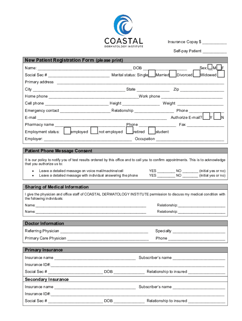 Insurance Copay $ ___ Self pay Patient ___New Patient Registration Form (please print) Name: ___ DOB ___Sex: __M __Social Sec # ___ Marital status: Single___ Married___ Divorced ___Widowed ___ Primary