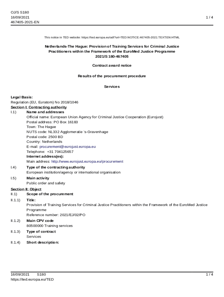 OJ/S S180 16/09/2021 4674052021EN1/4This notice in TED website: https://ted.europa.eu/udl?uriTED:NOTICE:4674052021:TEXT:EN:HTMLNetherlandsThe Hague: Provision of Training Services for Criminal Justice