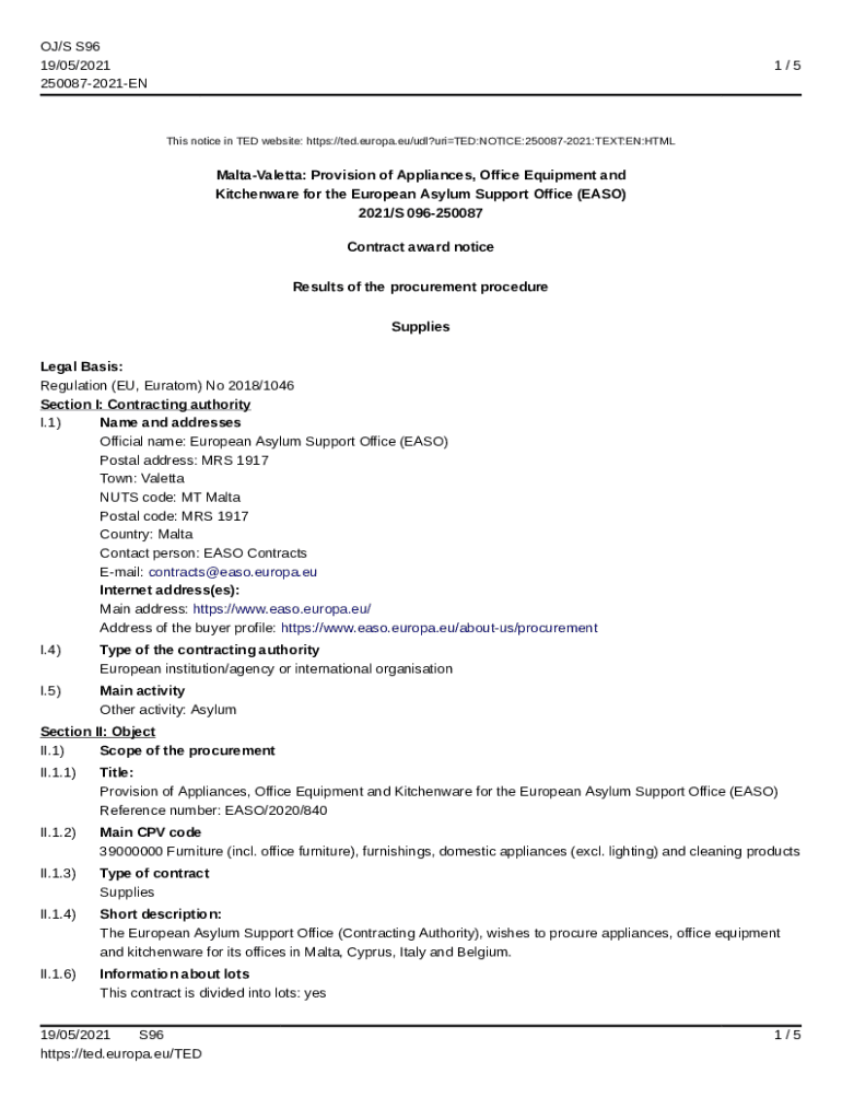 OJ/S S96 19/05/2021 2500872021EN1/5This notice in TED website: https://ted.europa.eu/udl?uriTED:NOTICE:2500872021:TEXT:EN:HTMLMaltaValetta: Provision of Appliances, Office Equipment and Kitchenware