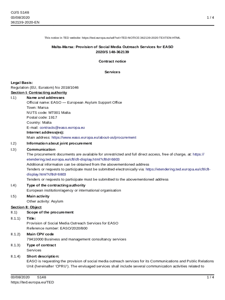 OJ/S S148 03/08/2020 3621392020EN1/4This notice in TED website: https://ted.europa.eu/udl?uriTED:NOTICE:3621392020:TEXT:EN:HTMLMaltaMarsa: Provision of Social Media Outreach Services for EASO 2020/S