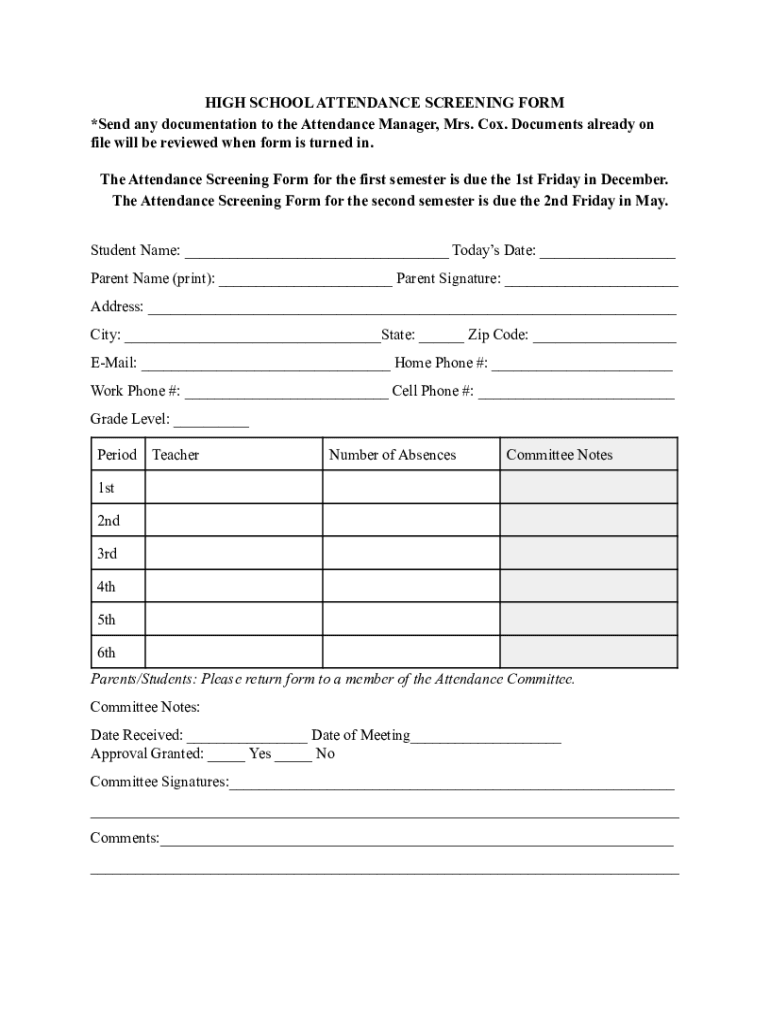 HIGH SCHOOL ATTENDANCE SCREENING FORM *Send any documentation to the Attendance Manager, Mrs. Cox. Documents already on file will be reviewed when form is turned in. The Attendance Screening Form