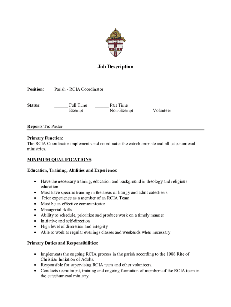 Job DescriptionPosition:Parish CIA CoordinatorStatus:___ Full Time ___ Exempt___ Part Time ___ Nonexempt ___ VolunteerReports To: Pastor Primary Function: The CIA Coordinator implements and coordinates