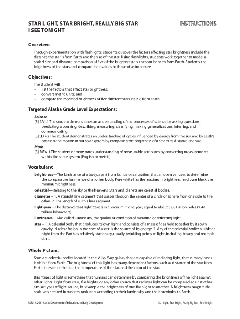 STARlight, STAR BRIGHT, Huge STAR I SEE TONIGHT Overview: Through experimentation with flashlights, students discover the factors affecting star brightness include the distance the star is from Earth