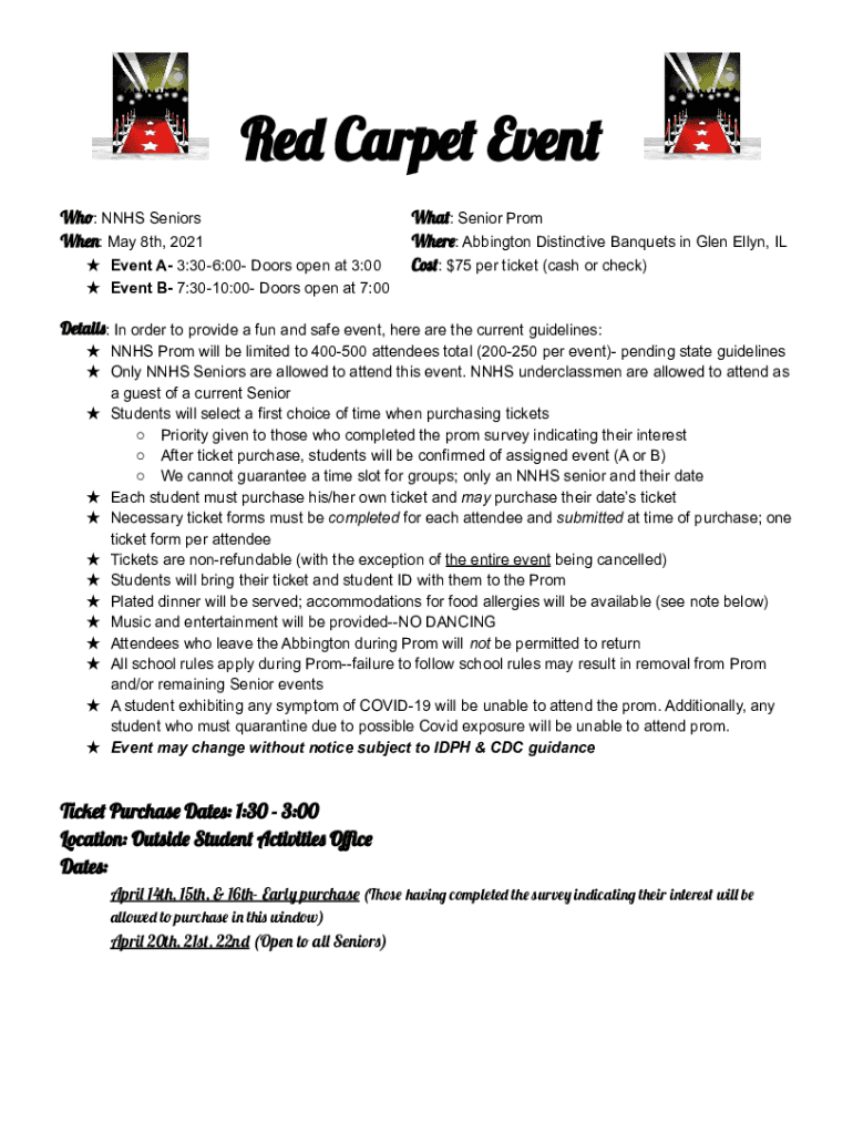 Red Carpet Event Who: NHS Seniors When: May 8th, 2021 Event A 3:306:00 Doors open at 3:00 Event B 7:3010:00 Doors open at 7:00What: Senior Prom Where: Abington Distinctive Banquets in Glen Ellyn,
